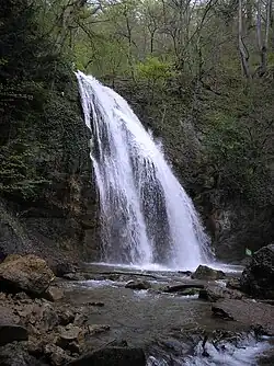 Djur-djur (Armenian: Ջուր-Ջուր — water-water; Crimean Tatar: Curcur — «onomatopoeia to the falling water»)[1] — waterfall is located on the Ulu-Uzen' river in the Crimean Mountains of Crimea. Waterfall height is 16 metres (52 ft). Djur-djur has not dried up ever, even in the dry years. Water from the waterfall falls into a small lake, and then comes into the river channel, which flows into the sea near the village Solnechnogorsk.[2]