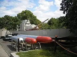 A much larger, slower, and less numerous but somewhat more powerful craft was the Zheleznyakov-class river monitor. Five of these were built at Kiev between 1934 and 1939 and all served in the Dnieper Flotilla. All were lost except the class leader, which is preserved at Kiev. These boats were 48 metres (157 ft) long and 7.6 metres (25 ft) wide with a displacement of 238.6 tonnes (263.0 short tons). They carried a crew of 70, had twin diesel engines generating 300 boiler horsepower for a speed of 14.1 kilometres per hour (8.8 mph), and were armed with a twin 4-inch (100 mm) main armament, two twin 44-millimetre (1.7 in) guns, and four machine guns.[9]