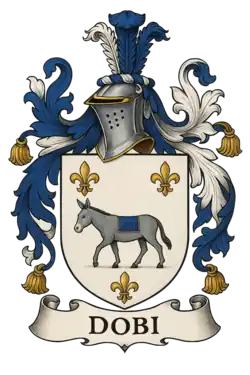 The surname may originate from the Hungarian personal name Dabó (Transylvanian form Dobó), or from a pet form of the personal name Dob. [2] Another theory on the origin of the Dobi surname may be as a diminutive of the Saxon personal name Hrodebert (ancient form of the English name Robert).[2]