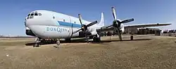 One of the landmarks in the area is currently on display at an inn next to the Dodgeville Municipal Airport. In 1977, the former owners of the Don Q Inn bought an old Boeing C-97G.[1] Its history was connected to two commercials for the Mercury Cougar in 1975 and actress Farrah Fawcett's signature was purported to be on fuselage until it was painted over in approximately 2010. The plane, whose tail number is N227AR (S/N 52-2764),[2] was built in 1952 and it logged a total of 10,068 hours of flight before being landed at the airport to much publicity on the airport's comparatively tiny 2,800' runway in 1977. As it landed, the main landing gear was a full 3 feet (0.91 m) outside the edge of the runway, creating a cloud of dust as the pilot, Dick Schmidt,[3] threw on the brakes and killed the engines to stop the massive plane.[4]