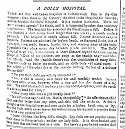 The Doll's Hospital (or Dolls' Hospital) was a toy shop at 16 Dawes Road, Fulham, London that was in operation for over 100 years[1] and repaired dolls sent by postal mail. The business eventually acquired an international reputation for its restoration workshop, including media coverage in the Illustrated Sydney News, "Patients are admitted for broken heads, or fractured limbs, loss of hair, eyes, nose, teeth, fingers, hands, toes, and wasting away of the body. Operations take place every day between 9am and 8pm."[2]