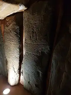 On the surface it resembles a circle-like mound with a diameter of 75 metres (246 ft).[5] It has a V-shaped passage 20.9 metres (69 ft) long[5] starting at the 0.8 metres (2 ft 7 in) wide,1.55 metres (5 ft 1 in) high western entrance, which expands to 3.1 metres (10 ft) wide and 3.9 metres (13 ft) high in the east.[1] In the eastern end of the passage there is a chamber. During the equinox, the first sun lights the interior of the passage and the chamber for some minutes, and it is assumed this was to denote an eventual re-birth of the buried.[2] Several of the standing-stones have engravings, and it is viewed as one of the largest dolmens in Spain.[4] The passage has 31 standing-stones in the northern part of the passage and 33 in the southern part.[1] The standing stones are of quartzite, sandstone, and limestone and carry 20 capstones that make the roof of the passage.[1]