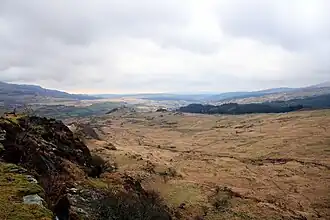 The Lledr Valley contains a number of earthworks. On the side of Garnedd Pen y Bont to the north of Blaenau Dolwyddelan are a pair of huts dating from the Iron Age or Romano-British era.[12] Blaenau Dolwyddelan also contains Ty'n y Ddol, a medieval long hut 'of national importance.'[13] All three sites are scheduled monuments. A boundary bank marks part of the community's border with Beddgelert in the west, across the Bwlch y Rhediad pass between Carnedd y Cribau and Cerrig Cochion. It may originally have marked the boundary of lands belonging to Aberconwy Abbey, which are mentioned in a charter of c. 1198.[14]