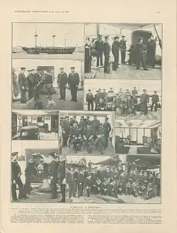 Top right to bottom right: Sailors firing a Canet cannon. Petty officers next to an Armstrong gun. The Captain's quarters. The ship's crew.