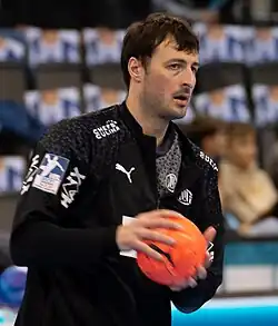 Domagoj Duvnjak (born 1 June 1988) is a Croatian professional handball player for THW Kiel.[1] Regarded as one of the best handball players of all time, he was named the IHF World Player of the Year in 2013 and has won over twenty titles playing for clubs in Croatia and Germany.[2][1][3] Duvnjak began his senior club career at local team RK Đakovo in 2004, before moving to fellow Croatian club RK Zagreb two years later. In August 2009, Duvnjak signed a three-year contract with German team HSV Hamburg worth €2.25 million, including a transfer fee of €1.1 million, making him the most expensive handball player in history at the time.[4] He has played for German club THW Kiel since 2014 and is the team's captain.[5]