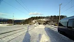 Looking north at Dombås Station, the Dovre Line heads into the right tunnel while the Rauma Line heads into the left tunnel.