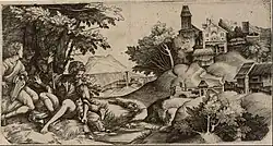 Born probably in Venice, he was the pupil of his father, the leading engraver and painter Giulio Campagnola. He appears to have been adopted by his father as a young boy.[1] His grandfather, Girolamo Campagnola was a famous humanist and painter in Padua (end of the 15th century).[2] He was presumably trained initially by his father, and may also have been a pupil of Titian, with whose workshop he was clearly associated. Much of his early painting may be of landscape backgrounds in Titians. He is mainly remembered for his prints and his drawings, especially of landscapes. In his lifetime he was a successful painter, mostly in Padua (Giulio's home town), where he was mainly based from the early 1520s onwards, until his death there in 1564.[3] Mostly he painted on walls, including decorative schemes, but portraits and landscapes are also attributed to him. His works as a painter are not highly regarded by modern art historians though some landscapes are of high quality.