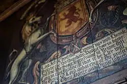 Carved roundels with the coats of arms of Mary of Guise, Henry II of France, and Regent Arran decorated a house in Blythe's Close on the Castlehill, the upper stretch of the Royal Mile, in Edinburgh. It is thought the house may have been a lodging used by Mary of Guise.[133] After the building was demolished in 1845, the Blythe's Close roundels were in the collection of Charles Kirkpatrick Sharpe, and then at Dunrobin Castle. They were acquired by the National Museums of Scotland in 2021.[134][135] Perhaps in 1558, similar roundels were carved for the audience chamber of Holyrood Palace. These armorials were originally painted with bright colours using orpiment and azurite. No documentation survives to name the carvers of the Edinburgh armorials.[136]