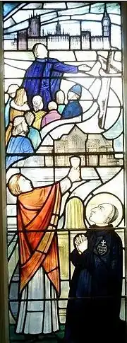 In October of that same year Barberi visited Littlemore, where Newman made his confession to him.[10] Newman relates in his "Apologia" how Barberi arrived soaked from the rain and as was drying himself by the fire when Newman knelt and asked to be received into the Catholic Church.[11] This event is marked by a sculpture in the Catholic Church of Blessed Dominic Barberi at Littlemore. Two of Newman's companions at Littlemore were also received, and Barberi celebrated Mass for them the following morning.