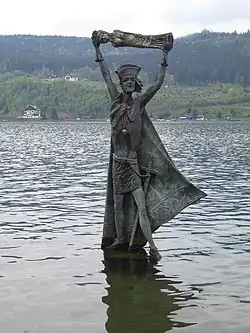 Domitian was then baptized and beside the tomb of his son built the first Christian church. After his conversion, he ordered to gather a thousand statues of pagan gods and goddesses and to throw them into the lake. Later a settlement arose around the church, which today is called Millstatt (Milštat); derived from the Latin term mille statuæ - "a thousand statues" which he had destroyed.[4]