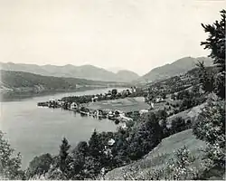 The etymology, however, has not been conclusively established. Milistat was first mentioned around 1070; linguists have derived the place name from "mill" (German: Mühle, Slovene: mlin), as there formerly were many mills around the lake.[5] A more recent interpretation refers to the local brook once called Mils (today: Riegenbach or Leitenbach); its name being of Celtic origin, meaning "mountain stream".[6] Likewise, the Slovene term Mela denotes water that brings meli, sand and gravel, to which also corresponds the newer German name Leitenbach.[7] Another theory derives the name Milštat from the Slovene word milost (kraj milosti), i.e. "grace" ("a place of grace") in connection with the miraculous events at the site.[8]