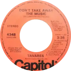 "Don't Take Away the Music" is a hit song by R&B/disco group Tavares, released in the fall of 1976. It peaked at number 34 on the US Billboard Hot 100 singles chart[1] and at number four in the UK. Along with the track "Heaven Must Be Missing an Angel", the song spent two weeks at number 1 on the Hot Dance Club Play chart.[2]