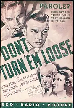 Don't Turn 'Em Loose is a 1936 American crime drama film directed by Ben Stoloff and produced by RKO Radio Pictures, who released the film on September 18, 1936. Written by Harry Segall and Ferdinand Reyher, the production's screenplay is at least partially based on "Homecoming" by Thomas Walsh, a short story published in Collier's magazine in March 1936.[1] The film costars Lewis Stone, James Gleason, Bruce Cabot, Louise Latimer and Betty Grable.