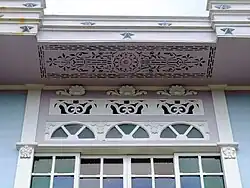 At the exterior of the house, intricate carvings decorates the corbels, brackets and pilasters. A simple yet elegant roof parapet decorated with five pointed stars can be seen on the top of the house.