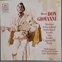 Don Giovanni is a 1959 studio recording of Wolfgang Amadeus Mozart's opera of the same name, released by the EMI label with the Philharmonia Orchestra and Philharmonia Choir conducted by Carlo Maria Giulini. The recording features Eberhard Wächter as Don Giovanni, Joan Sutherland as Donna Anna, Luigi Alva as Don Ottavio, Elisabeth Schwarzkopf as Donna Elvira, Gottlob Frick as the Commendatore, and Giuseppe Taddei as Leporello.