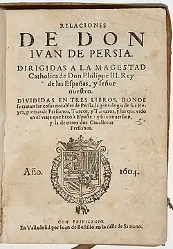 He also wrote an account of Iran, his involvement there with Shah Abbas I, and his journey to Spain in the Persian embassy to Europe (1599–1602) which was translated and published by a Mercedarian[8] called Alonso Remón under title Relaciones de Don Juan de Persia in 1604, Valladolid.