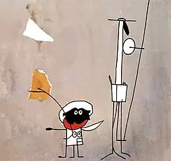 The author reduced the characters in the short to Klee-style ideograms, with backgrounds being represented by abstract frescoes,[1] all of which is accompanied by atonal music.[2]
