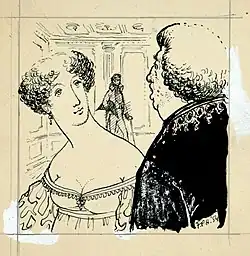 Donizetti had just returned to Paris from Vienna in the autumn of 1842 and it was there that it was suggested to him by Jules Janin, the newly appointed director of the Théâtre-Italien, that he might compose a new opera for that house.[5] Janin prepared a formal proposal on 27 September, but while no specific subject nor title was mentioned, Janin suggested that it should be a new opera buffa tailored to the talents of some major singers including Giulia Grisi, Antonio Tamburini, and Luigi Lablache.[5]