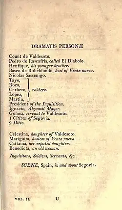 Don Pedro is a tragic play by the British writer Richard Cumberland. It was first staged at the Theatre Royal, Haymarket in London on 23 July 1796.[2] The original cast included James Aickin as Count Valdesoto, Charles Kemble as Henrique, John Palmer as Pedro De Rascifiria, John Bannister as Basco de Robeldondo, Richard Suett as Nicolas Sassenigo, Thomas Caulfield as Tayo, George Wathen as Roca, Robert Palmer as Cerbero and Elizabeth Kemble as Celestina, Sarah Harlowe as Mariguita, Maria Kemble as Cattania and Elizabeth Hopkins as Benedicta. The epilogue was written by George Colman the Younger.