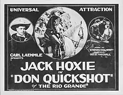 Don Quickshot of the Rio Grande is a 1923 American silent Western film directed by George E. Marshall and written by George Hively. The film stars Jack Hoxie, Emmett King, Elinor Field, Fred C. Jones, William Steele, and Bob McKenzie. It is based on a 1921 short story of the same name by Stephen Chalmers.[1] The film was released on June 4, 1923, by Universal Pictures. The film was Hoxie's first film with the company[2] and Harry Woods's first screen credit.[3]