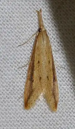 Donacaula melinella is a moth in the family Crambidae. It was described by James Brackenridge Clemens in 1860.[1] It is found in North America, where it has been recorded from Ontario, Alabama, Arizona, Arkansas, Connecticut, Delaware, Florida, Georgia, Illinois, Indiana, Kentucky, Louisiana, Maine, Maryland, Massachusetts, Michigan, Mississippi, Nebraska, New Jersey, New York, North Carolina, Pennsylvania, South Carolina, Texas and Virginia.