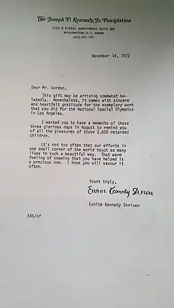Because of the success with the SDE line, Gordon reached out to Eunice Kennedy Shriver and the Special Olympics and ended up coordinating the 1970 Special Olympics[8] in Southern California and working with Olympic Decathlete Rafer Johnson at the games.