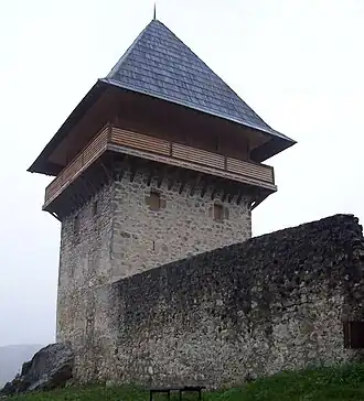 In 1407, Sigmund led the Hungarian army and attacked Donji Kraji, but was stopped. The turning point came after the Sigmund victory in the Battle of Dobor (1408). Hrvoje did not personally participate in the battle, but the disaster of the Bosnian forces led him to reconcile with the Hungarian king. In doing so, he lost all the privileges he received from Ladislaus and his power declined.[46] Hrvoje turned to the Ottomans and brought them to Bosnia resulting in the Battle of Doboj (1415) where Hungarians were defeated. He died at the beginning of 1416 after which his possessions disintegrated rapidly, and while parts remained within the family other were integrated into royal demesne. His widow Jelena later married the Bosnian king Ostoja. A major fortified castle of Jajce, which was built in the 14th century and initially was seat of Hrvoje Vukčić, now became one of the capital cities of the Kingdom of Bosnia[47] as Jajce too, in the aftermath of Hrvoje's death, has passed back to the royal domain. It was royal domain located in Donji Kraji, as Stephen Thomas refers to it as "royal seat",[48] and its citadel has a portal decorated by his Kotromanić royal coat of arms.[48]