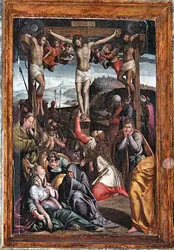 He worked chiefly at Assisi. For the church of San Crispolto of Bettona, he painted an Adoration of the Shepherds (1543), now at the Pinacoteca Civica of the town. For the Ciccoli family chapel at the church of San Francesco in Bevagna, he painted a Madonna and Child (ca. 1565), now in the city picture gallery. In Foligno, he painted a fresco depicting the Nativity with St Lucy (1544) for the monastery of Sant'Anna; a frieze for the Sala Papale (attributed, ca. 1545) of Palazzo Trinci; and a fresco depicting the Martyrdom of St Catherine of Alexandria for the nunnery of Santa Caterina Vecchia, now detached and in the Pinacoteca Civica. In Gubbio, he painted a Pietà (after 1560) and a Road to Calvary (ca. 1564) now in the Duomo.[3] He also worked with Lattanzio Pagani and Cristofano Gherardi at the no longer-extant Rocca Paolina of Perugia.