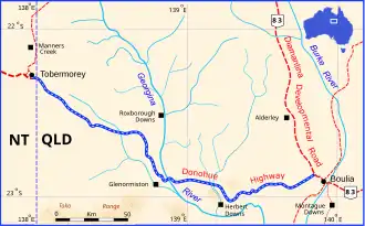 The road branches from the Diamantina Developmental Road 7 km (4 mi) north-west of Boulia and proceeds towards the Northern Territory. The Georgina River is at about the 166 km mark and 83 km further is Tobermorey, a town with 20 inhabitants. From here the trail continues as the Plenty Highway towards Alice Springs.[1] The route is mostly unpaved and marked by corrugations, deep potholes and bulldust (fine red desert dust). However, in 2009 further development in the form of river crossings were initially attached and further parts of the road are paved.[2] Despite the improvements to the track, it is often impassable after heavy rain.[3]