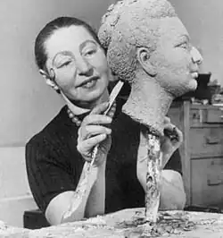 At the outbreak of World War II, Gordine's career was brought to a halt. She no longer had access to Valsuani's in Paris, her favourite foundry, and bronze quickly became rationed. All foundries in Britain were ordered stop all non-essential activity and concentrate on war production. It was not until late 1943 or early 1944 that she found a new foundry and was able to have some of her latest bronze work exhibited in the Royal Academy in 1944.[17] During the 1940s/50s Gordine's work was exhibited regularly at the Royal Academy, the Society of Portrait Sculptors and elsewhere. In October 1945 she had a solo exhibition at the Leicester Galleries, in which The Times described her as having ‘much ability, though she is eclectic in her inspiration, being influenced by works from many schools and periods – Indian and Egyptian among others. Her best works are her portrait heads in bronze which are convincing and straightforward.’[18] Bronzes from this time have ironic or humorous titles, relating to the pose, such as Great Expectations or Mischief and, of an RAF officer, Above Cloud. She was elected a Fellow of the Royal British Society of Sculptors in 1949. She occasionally did exotic or erotic pieces (e.g. for Elizabeth Choy). She travelled and lectured in America, working in Hollywood, art lecturing and designing film sets[19] in 1947 and revisited the US in 1959.[20]