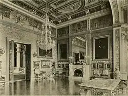 - "The green and red drawing-rooms follow in succession from the saloon. The ceilings of both were painted by Signor Anglinatti while the frieze of the latter is a bright bit of work by Sir Coutts Lindsay... The furniture of these drawing-rooms is well worth notice. Every piece is good of its kind and is thoroughly adapted to the style of its surroundings and its individual place."[11]