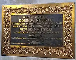Neligan died at her home in Croydon in 1914,[2] not seeing the result of her efforts, that some women were to get the vote in 1918. Her obituary was published in the Women's Freedom League (WFL) newspaper, The Vote,[9] A wreath was sent to her funeral from the WSPU leader, Emmeline Pankhurst "With love and remembrance for a brave veteran, whose life was spent in noble work for women and for the race,"[4] along with flowers from the local WSPU branch and a wreath from the WFL.[4] A memorial plaque is in Croydon Minster, and at the centenary of (some) women's franchise,[10] the Croydon Central M.P., Sarah Jones had described Neligan as one of the women who offer inspiration to young women of today.[11] And the Croydon Museum project created a banner with her name and the Croydon High School ivy logo image, and the words 'Veteran Suffragette'.[12]