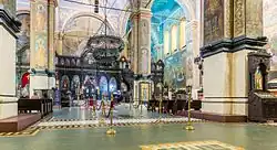The furnishing of the interior, however, also continued in the following years. The bishop's throne, the work of Niko Mavrudi, was placed in 1897 and the iconostasis was manufactured later by master Ivan Filipov from Debar. It was decided that a new and separate bell tower would not be erected and instead a dome would be lifted and a part of the original building adapted for the purpose. The bell was supposed to weigh 100 poods (1.6 tons) and bear the inscription "In honour of the Liberator". 42 small and 3 large icons were brought from Russia as a donation by Nicholas II in 1901, additional 8 intended for the middle and north doors following in 1904. The church's floor was covered with ceramic tiles of different colours in 1911 and the balcony was finished four years later.