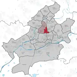 Location of Dornbusch (red) and the Ortsbezirk Mitte-Nord (light red) within Frankfurt am Main | |