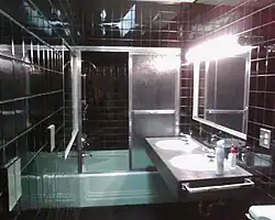 Today, the main floor is occupied by two businesses, a bar and restaurant known as the "Windbag Saloon and Grill", and the adjacent "Ghost Art Gallery", which has its framing shop on the second floor, in the area that once included the main entrance, a large sitting room, and Dorothy's personal residence.[3] Most of the remaining upstairs rooms have been converted to office space,[4] but one room has been kept precisely as it was at the time of the police raid in 1973; her bathroom—which has an unusual black-and turquoise green decor, cutout starbursts in the dropped ceiling, and an oversized bathtub.[3] The other businesses that occupy the 2nd floor include, Misty Boles Intimate Photography, and in 2021, the Ghost Art Gallery moved their gallery upstairs to make way for a lounge and gaming parlor,[9] that was opened in the vacated space. There are numerous reports that the building is haunted.[10]