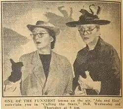"Calling the Stars" was an expensive radio show created by 2GB in Australia and sponsored by Colgate-Palmolive. The stars of the show included comedians Jack Davey, `Mo’ (Roy Rene) and Willie Fennell. Foster and her partner and now friend read double entendres as the, not too bright, "Ada and Elsie" as part of Foster's regular scripts. In 1940, the 2GB station was said to be the largest producer of radio drama programs in the southern hemisphere[4] and she created her own company "Dorothy Foster Radio Features".[1]