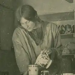 Johnstone was born in Edinburgh in 1892 and grew up in Napier Road, near the Gothic Mansion, Rockville.[1] Her father, landscape artist George Whitton Johnstone RSA (1849–1901),[2] encouraged her artistic talents, and at the age of 16 she enrolled as a student at the Edinburgh College of Art. She took the Life Class with Ernest Stephen Lumsden where she revealed her talents at informal portraiture, a genre for which she became well known. In 1914 she became a member of staff at the Edinburgh College of Art.[3] From the summer of 1915, she became a regular annual visitor to Kirkcudbright in Galloway, where she would paint with other mainly female artists including Jessie M. King as part of the Kirkcudbright School.[4][5] Dorothy Johnstone, with her close friends Cecile Walton[6][7] and Mary Newbery,[8] was a member of The Edinburgh School, which reformed in 1919, a collective of gifted and progressive artists associated with the Edinburgh College of Art. During 1919 she was living in Kirkcudbright where she had an affair with Vera Holme who would go on to be the 'Pankhursts' chauffeur'.[9]