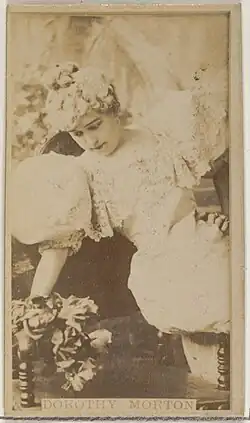 Morton began her professional stage career performing with the Henderson Opera Company in St. Louis, and then on tour.[6] In the Spring of 1888 she joined the touring production of William A. Mestayer's The Tourists in the Pullman Palace Car with the Kirke & Clarke theatre troupe.[5] She then worked as a member of 'Hallen and Hart', a theatre troupe led by actors Fred Hallen and Joe Hart, from 1888 to 1890. With that company she portrayed the role of Mollie Waits in Henry Grattan Donnelly's musical farce Later On;[7] initially using the stage name 'Doddie Morton'.[8] A touring production, the company took the musical to a variety of theaters throughout the United States, including Hooley's Theatre in Chicago,[9] Broadway's Star Theatre,[7] the Grand Opera House, Brooklyn,[10] and the Bush Street Theatre in San Francisco.[11] By the time the tour reached Sacramento's Metropolitan Theatre in April 1890, she was billed as Dorothy Morton;[12]