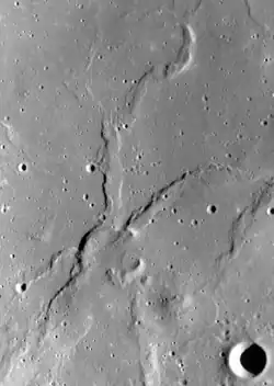 The ridge starts near Dorsa Geikie, trends northeast, and ends in the vicinity of Webb crater.