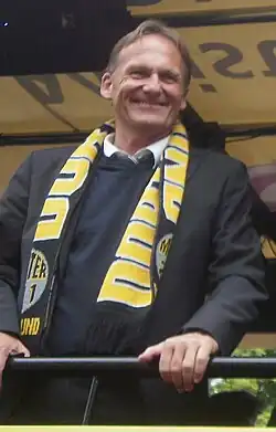 The stock of Borussia Dortmund GmbH & Co. KGaA was floated on the stock market in October 2000 and is listed in the General Standard of Deutsche Börse AG. Borussia Dortmund GmbH & Co. KGaA became the first and, so far, the only publicly traded sports club on the German stock market. 4.61% of Borussia Dortmund GmbH & Co. KGaA is owned by the sports club, Borussia Dortmund e.V.; 8.24% by Bernd Geske; and 67.24% widely spread shareholdings.[81] Hans-Joachim Watzke is the CEO and Thomas Treß is the CFO of the GmbH & Co. KGaA. Michael Zorc as sporting director is responsible for the first team, the coaching staff, the youth and junior section, and scouting.[82] The supervisory board consists, among others, of politicians Werner Müller and Peer Steinbrück.[83]