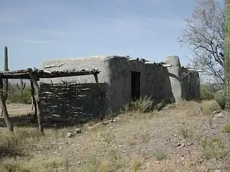 The main ranch house, is regarded as a rare example of the earlier "Sonoran traditional ranch style," characterized by thick adobe walls, weather exposed or stuccoed, beamed ceiling, flat roof and floor of packed earth, often laid out in an L-form. An outbuilding is built of railroad ties covered with corrugated roofing.[2][3]