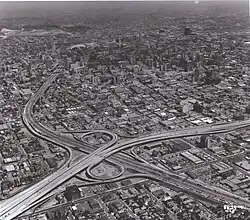 By 1957, the California Division of Highways (now the California Department of Transportation) had accounted for an interchange in planning the construction of the Santa Monica Freeway, with construction of the interchange being included in the freeway's initial segment which started at the East Los Angeles Interchange.[2] Construction work for the initial segment, valued at $8.4 million ($69.7 million in 2023 dollars),[2] began that summer on June 17, 1957,[3] with major grade separation and rerouting work for the interchange, requiring the temporary rerouting of the Harbor Freeway and the diversion of Venice Boulevard, taking place the following year.[4] In common with the East Los Angeles Interchange, which was built in the middle of majority-Hispanic Boyle Heights, the interchange's construction displaced an entire neighborhood — described by the Home Owners' Loan Corporation as being "thoroughly blighted" — primarily inhabited by African Americans, along with smaller numbers of Mexicans, Japanese and Italians.[5]