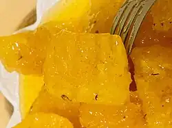 Dosi (Sinhala: දෝසි, Tamil: தோசி) is a traditional Sri Lankan confectionery,[1] similar in nature to fruit preserves or candied fruit. The dish is prepared by boiling segmented fruit in sugar and allowing it to cool in order for the sugar to crystallise on both the surface and the inside of the fruit. Dosi are traditionally served as a snack, during the day or after a meal.[2] It is a dish that is commonly served by Sri Lankan Malays as a part of traditional Eid al-Fitr celebrations, marking the end of Ramadan. It is also popular during weddings, religious festivals and other social functions and celebrations. Variations include the addition of cardamom and/or cinnamon and/or rose essence.