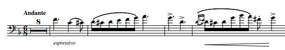 The second movement is lyrical and resembles an extended aria.[2] The movement is characterized by dramatic, unexpected dynamic changes and the incorporation of operatic characteristics such as the Italian lament and bel canto styles.[1]