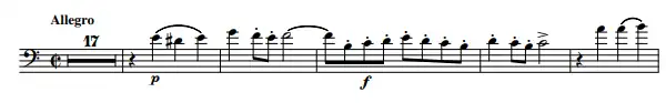 The first movement of the work opens in B minor. It has a short introduction, then takes on a lyrical bel canto style.[1] As the work is written for a bass tuned up two semi-tones, the opening E sounds as an F-sharp. In the development section, measures 38-90, the solo and accompaniment parts are in dialogue. During these interactions, the double bass part demonstrates rapid string changes and a variety of articulations. After measure 90, the solo part prepares for the cadenza, creating tension with an F-sharp pedal point. Different cadenzas are commonly performed at the end of the first movements, with some soloists writing their own.[4] Throughout the movement, the composer utilizes the entire range of the instrument, mimicking the human voice in both soprano and bass.