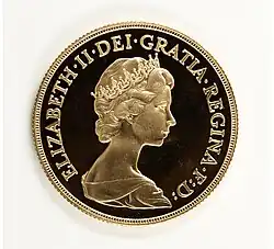 The reign of Queen Elizabeth II (r. 1952–2022) saw a departure from the normal practice in issuing gold coinage. A small number of gold £2 pieces, with an obverse by Mary Gillick, were struck in 1953 in order to provide continuity of the series, but the coins were not released to the public, and were placed only in museums and in the Royal Collection.[33] No further £2 gold pieces were struck until 1980.[32] The 1953 strikings bore an obverse legend of ELIZABETH II DEI GRA BRITT OMN REGINA F D (Elizabeth II by the Grace of God Queen of all the Britains, Defender of the Faith) but this was changed after 1953, removing BRITT OMN (of all the Britains) and modifying the abbreviations.[32] The omission was made to acknowledge the evolving British Commonwealth, which by then contained some republics.[34]