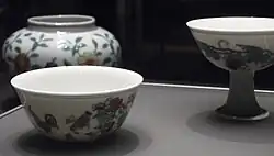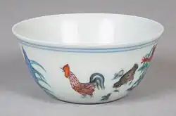 The style began in the 15th century under the Ming dynasty in the imperial factories at Jingdezhen, and its finest products come from a few years in the reign of the Chenghua Emperor, mostly small pieces like the famous Chicken cups.[2] The style was discontinued after a few decades, as a suitable overglaze blue was developed, but later revived under the Qing dynasty. It is not to be confused with the wucai style, which was a related early technique for polychrome painting.[3] Doucai can be translated as "contrasted colours",[4] "fitted colours",[5] "colours which fit together"[6] or "dove-tailed colours".[7]
