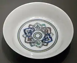 Doucai (Chinese: 斗彩; Wade–Giles: tou-ts'ai) is a technique in painting Chinese porcelain, where parts of the design, and some outlines of the rest, are painted in underglaze blue, and the piece is then glazed and fired. The rest of the design is then added in overglaze enamels of different colours and the piece fired again at a lower temperature of about 850°C to 900°C.[1]