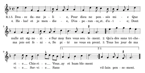 "Douce Dame Jolie", sometimes referred to only as 'Douce Dame', is a song from the 14th century, by the French composer Guillaume de Machaut. The song is a virelai, belonging to the style ars nova, and is one of the most often heard medieval tunes today. Many modern recordings omit the lyrics, however.