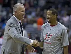 Collins worked as a broadcaster for about three years before being hired to coach the Washington Wizards for the start of the 2001–02 NBA season. In Washington, Collins was reunited with Michael Jordan and Charles Oakley. Once again, in his first season with his new team, Collins improved the team's previous season's record by 18 games.[16] Though his .451 winning percentage through two seasons was better than the Wizards' .308 record the previous two seasons (and subsequent .305 record the following season),[16] Collins was fired at the conclusion of the 2002–03 season.